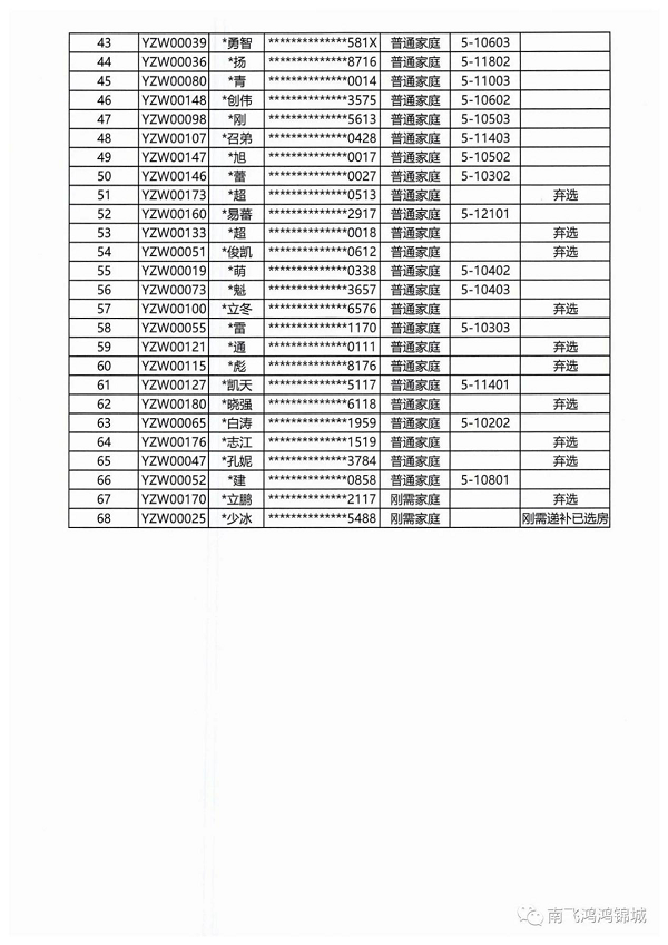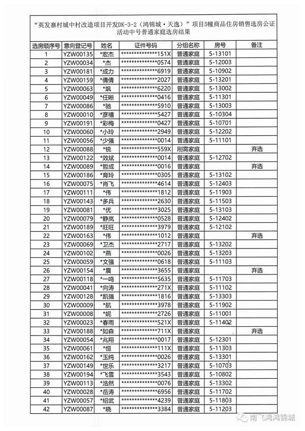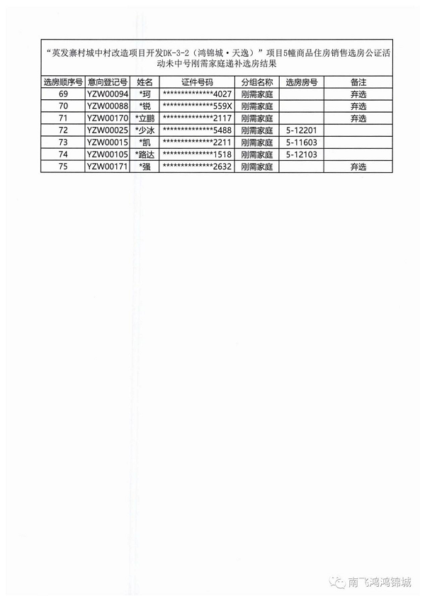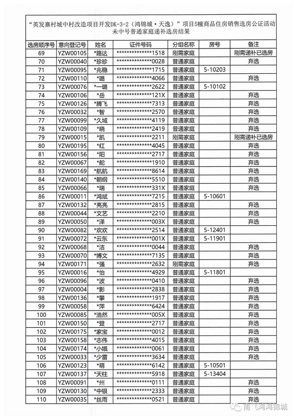 鸿锦城·天逸5幢商品住房销售选房结果公示